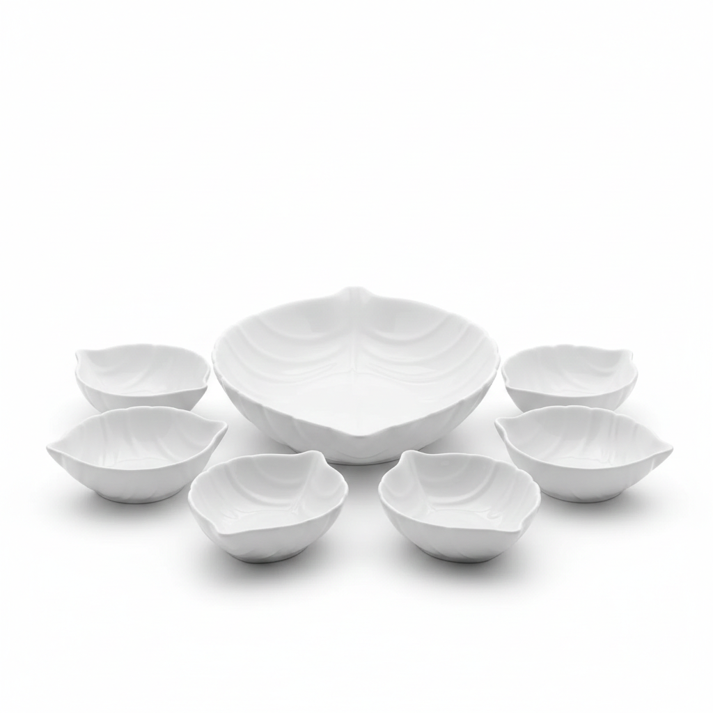 Eleva el nivel de tus presentaciones culinarias con el Set de Servir Leaves. Este conjunto de 7 piezas destaca por su sofisticado diseño inspirado en la silueta y nervaduras de las hojas, aportando un aire natural y minimalista a cualquier ambiente. Elaborado en vitrocerámica blanca de alta resistencia, ofrece un acabado brillante y liso que no solo es estético, sino también fácil de limpiar y duradero.